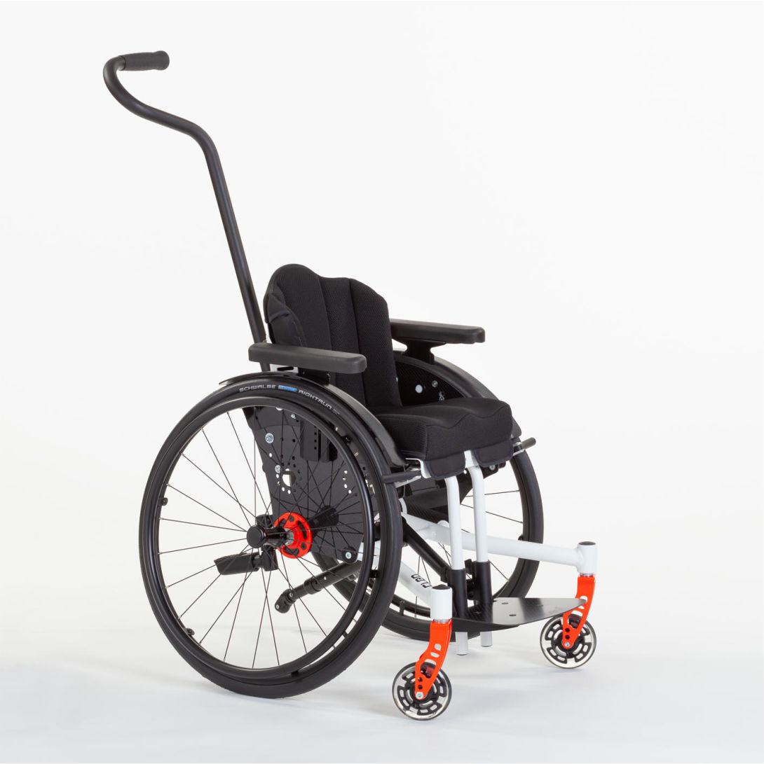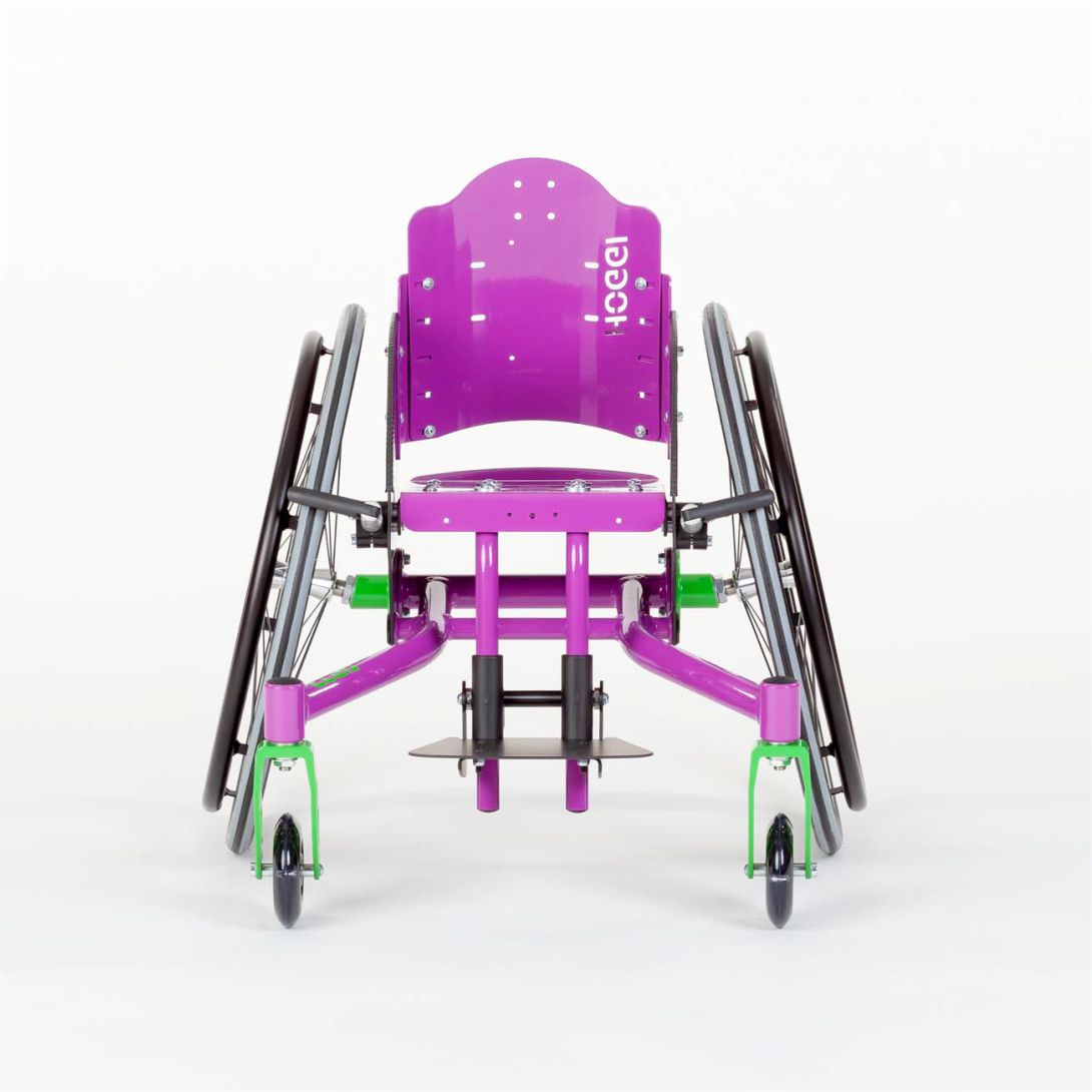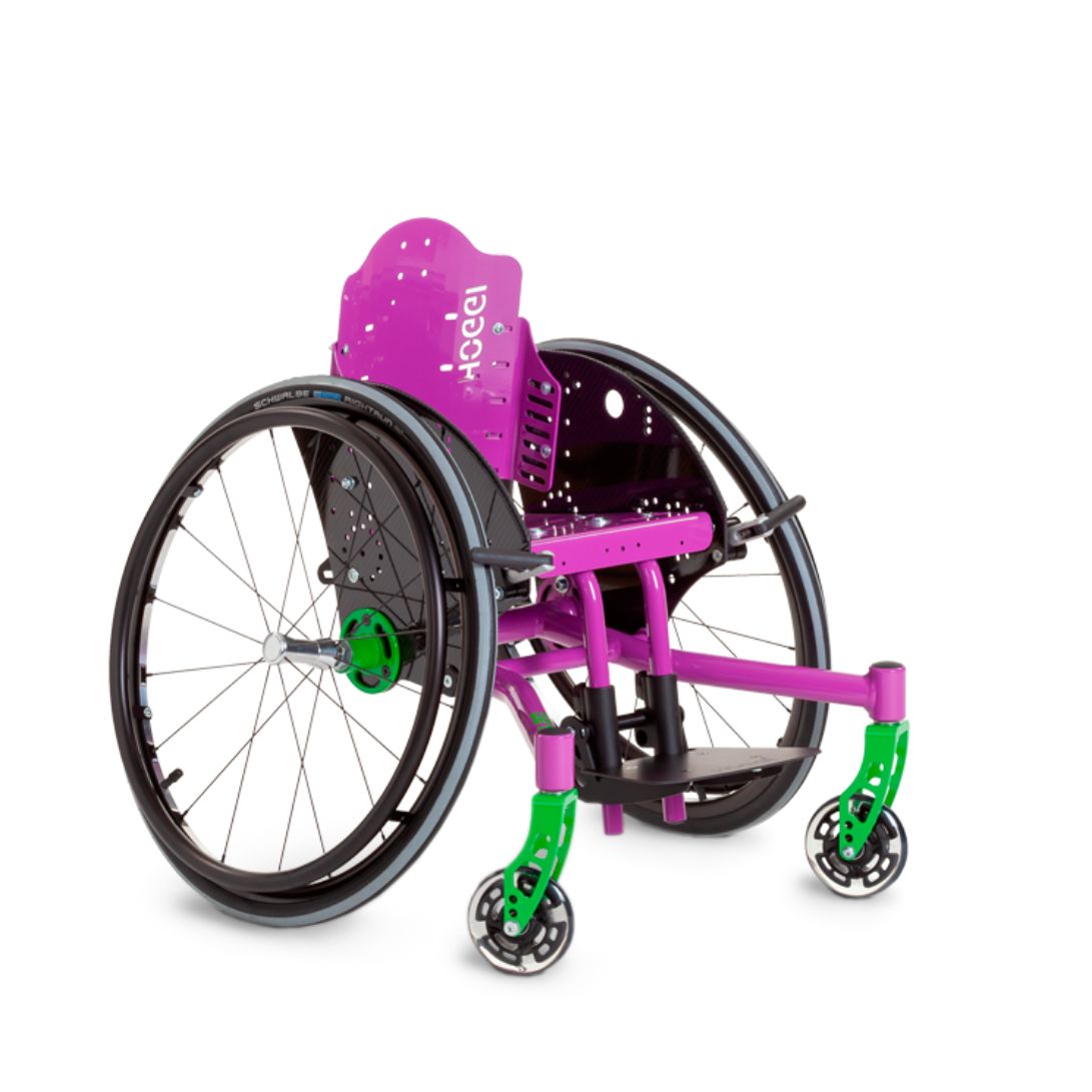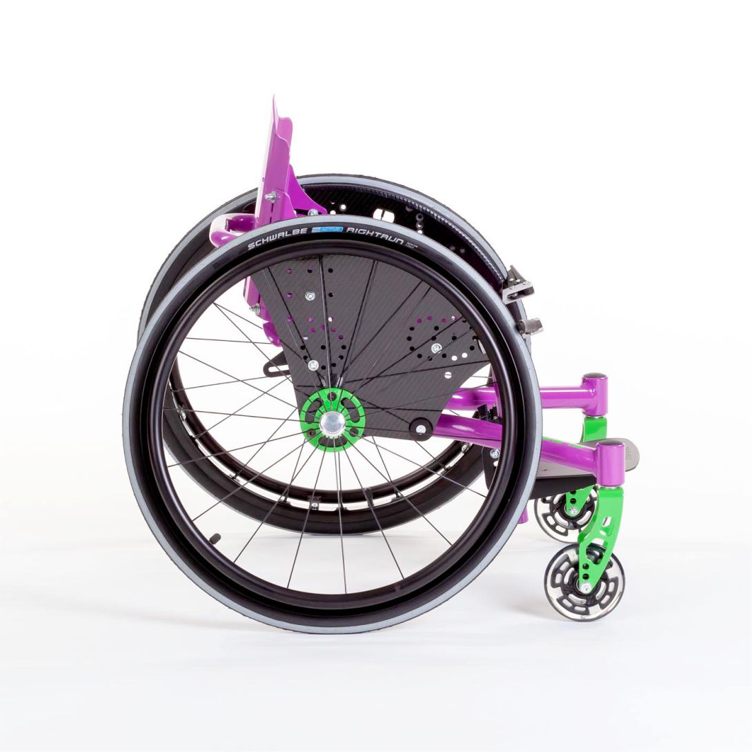 Silla de ruedas de autopropulsión ultra liviana de diseño deportivo para niños y adolescentes. Estructura de cuadro súper rígido con plegado frontal. Estructura anterior abierta para posicionamiento miembros inferiores en abducción.