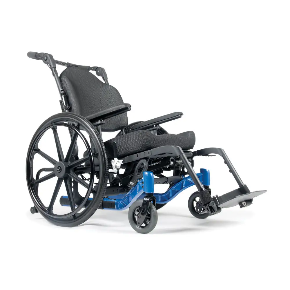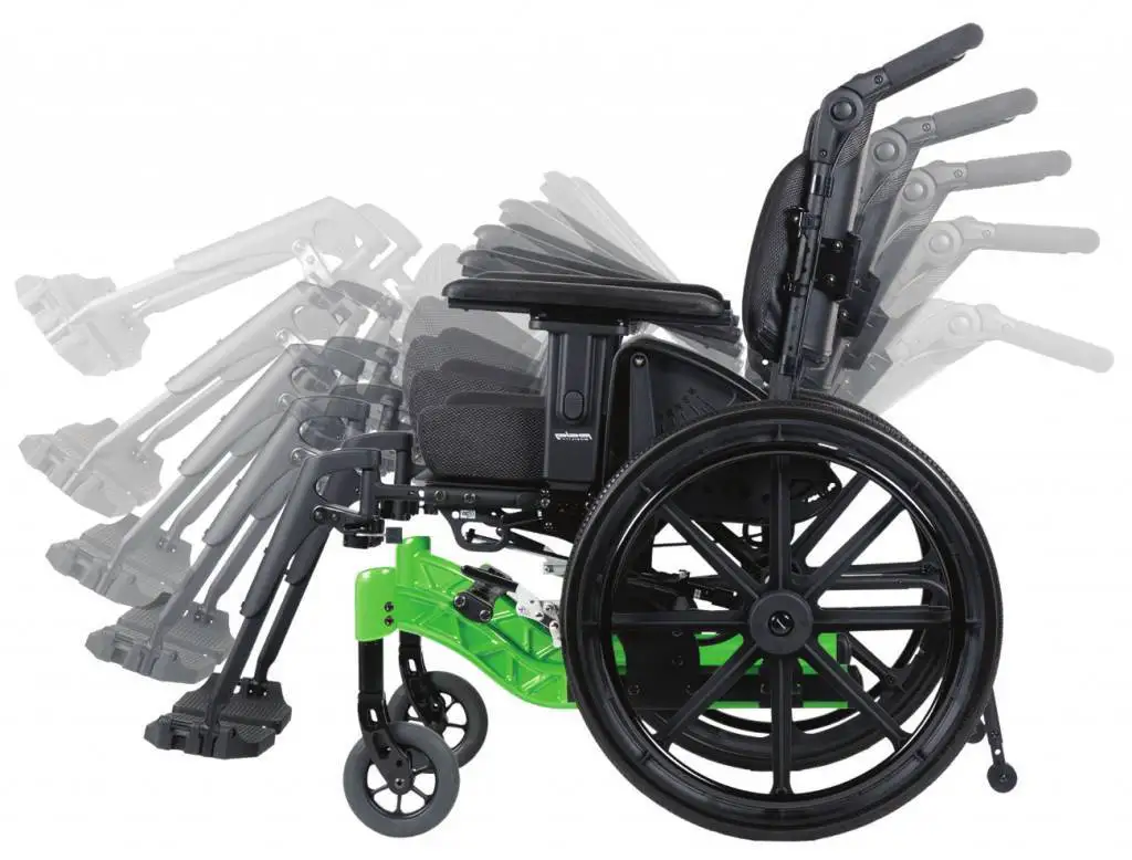 Accionamiento tilt dinámico hasta 50º para prevención y descargas de presiones de contacto (sistema anti escaras) con limitador por parte del acompañador sobre manija entera de empuje, regulable en inclinación 200º.