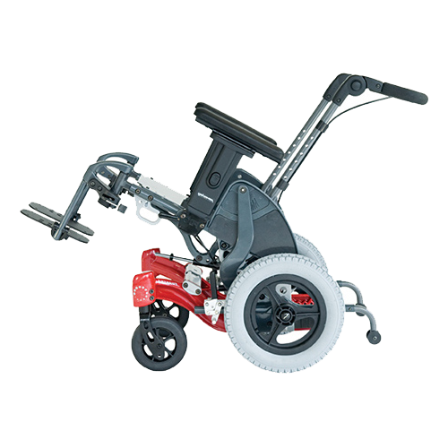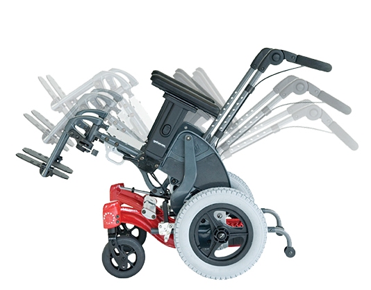 Accionamiento tilt dinámico hasta 50º para la distribución de presiones de contacto y aplicación sobre funciones posturales, respiratorias y de alimentación. Con limitador y gestión de la basculación por parte del acompañador sobre manija entera de empuje, regulable en inclinación 200º.