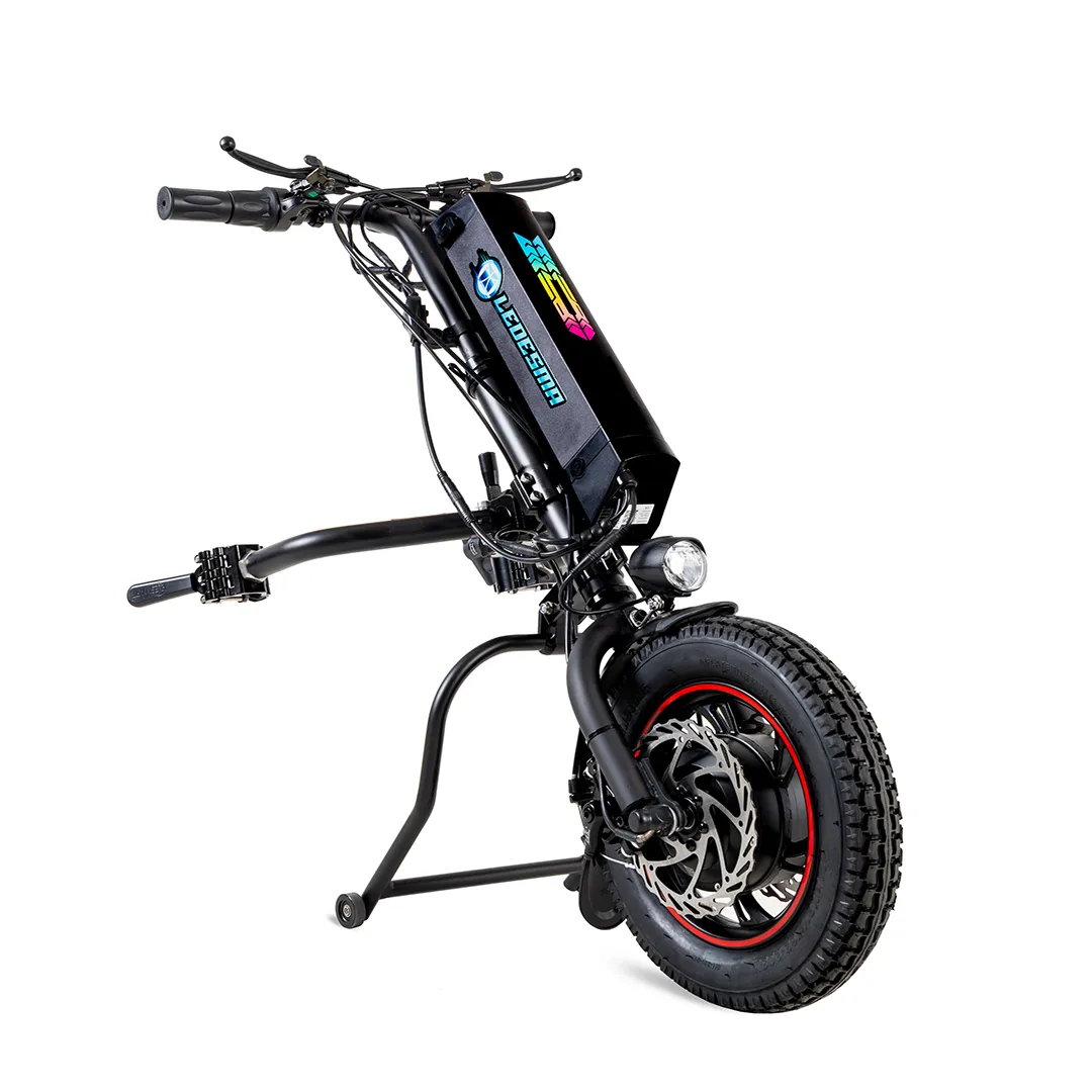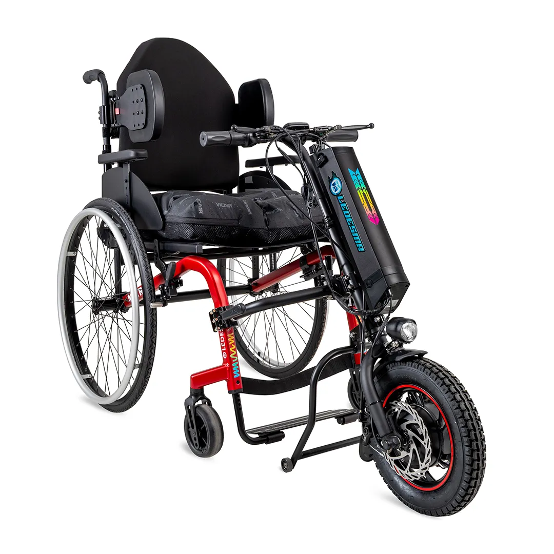 Handbike de fácil montaje. Acople y desacople facilitado, sin componentes fijos sobre la estructura de la silla de ruedas, rebatible para facilitar el transporte.