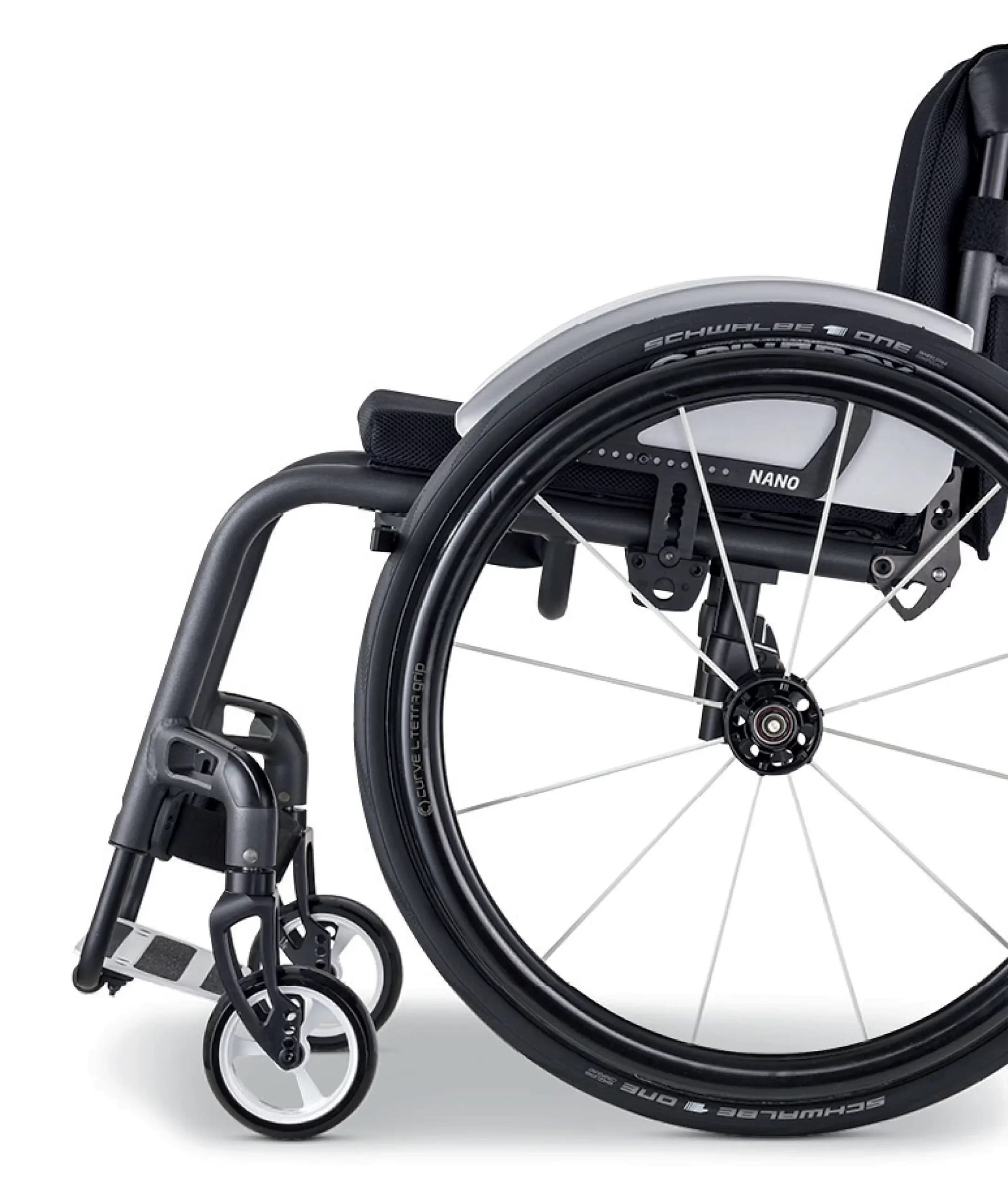 Silla de autopropulsión ultra liviana para la gestión postural con chasis rígido de cuadro abierto y contención miembros inferiores.