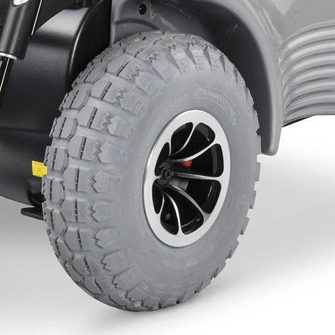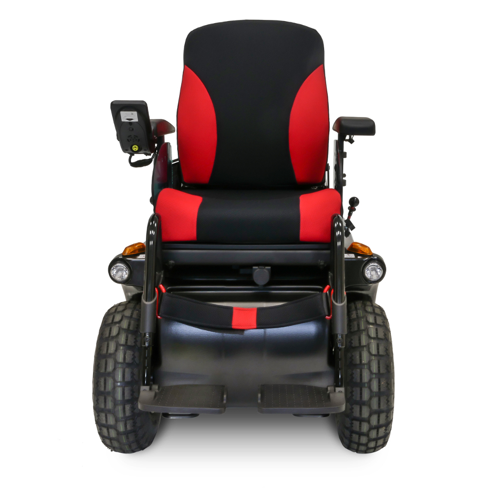 Silla motorizada electrónica de tracción anterior todo terreno, con servodirección asistida en ruedas posteriores. Suspensión reforzada todo terreno (off road).
