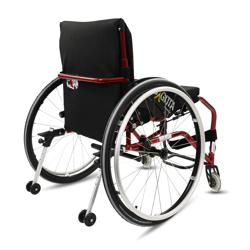 Silla de autopropulsión ultraliviana de chasis compacto en forma de “V” con plegado frontal confeccionada en