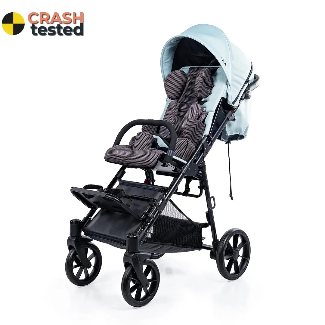 VILA ofrece muchas funcionalidades útiles, como la reclinación del respaldo y el reposapiés de altura ajustable. También permite ampliar la altura del respaldo, la profundidad y el ancho del asiento (desplegándolo), cuenta con base rigida de aluminio, la que permite colocar todo tipo de accesorio postural o de sujeción.
